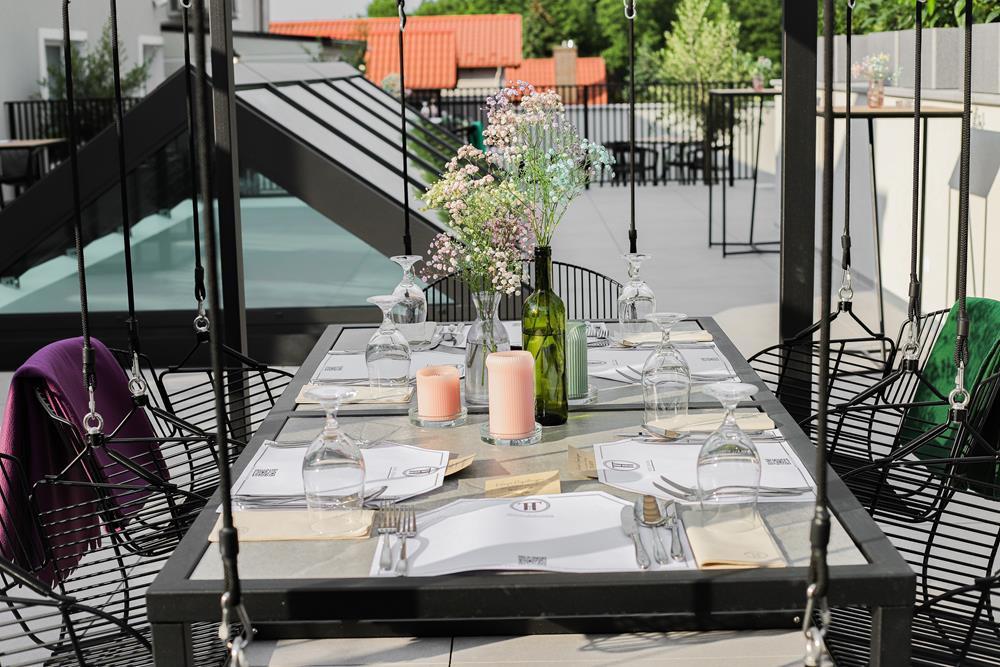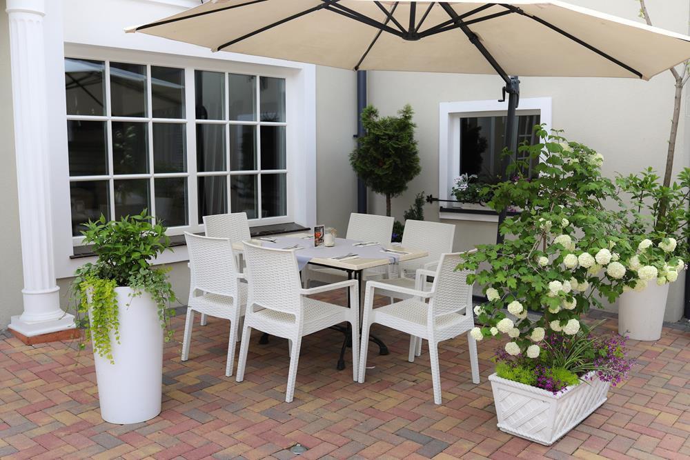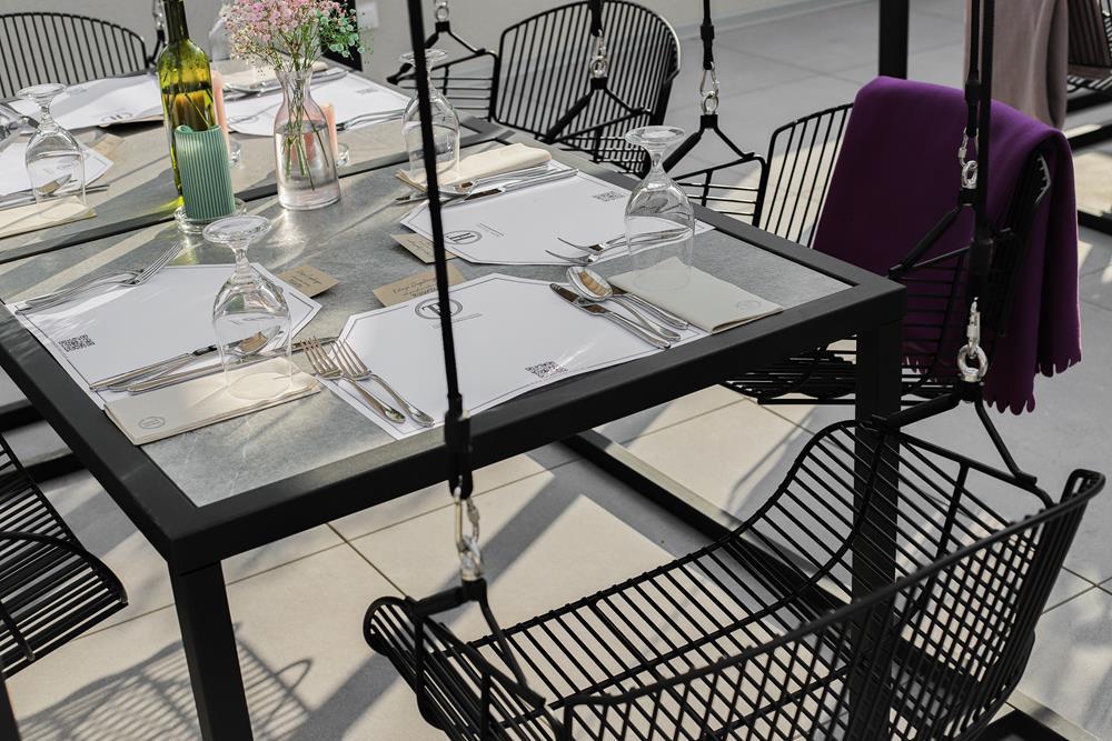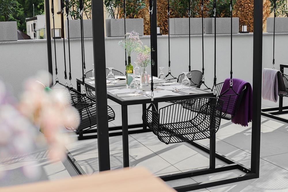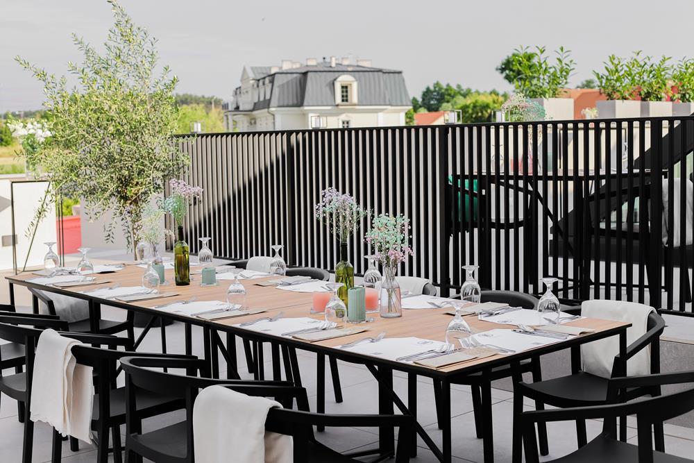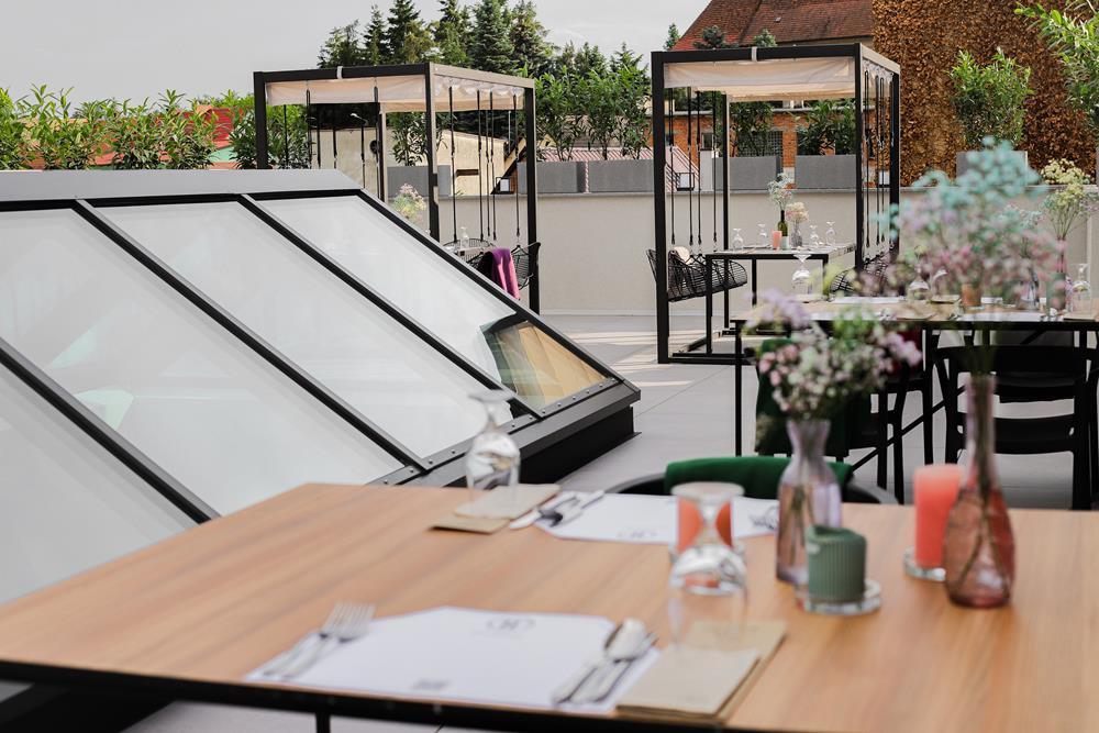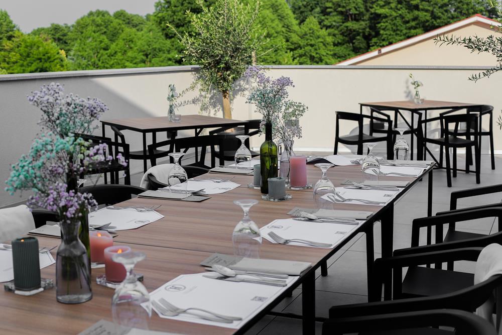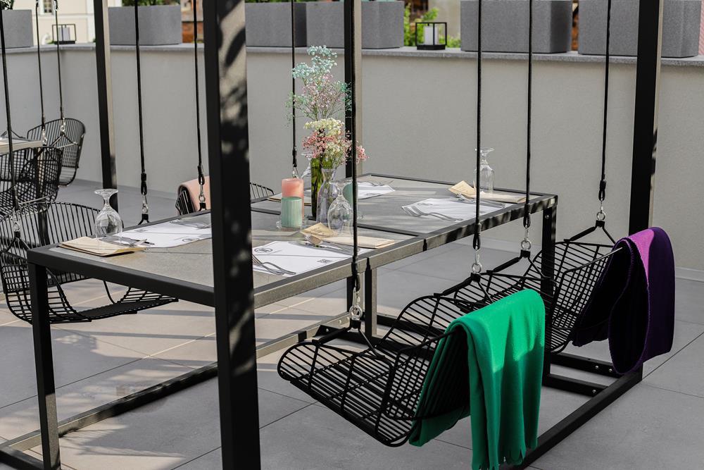 Przestrzeń na świeżym powietrzu jest otwarta w sezonie letnim i gwarantuje niezapomniane chwile relaksu. Zarówno obok restauracji, jak i na tarasie z malowniczym widokiem, będziesz mógł cieszyć się świeżym powietrzem i przyjemnym ciepłem letniego słońcem.
